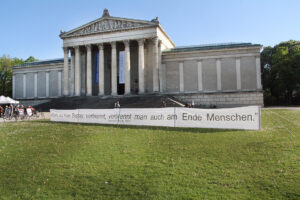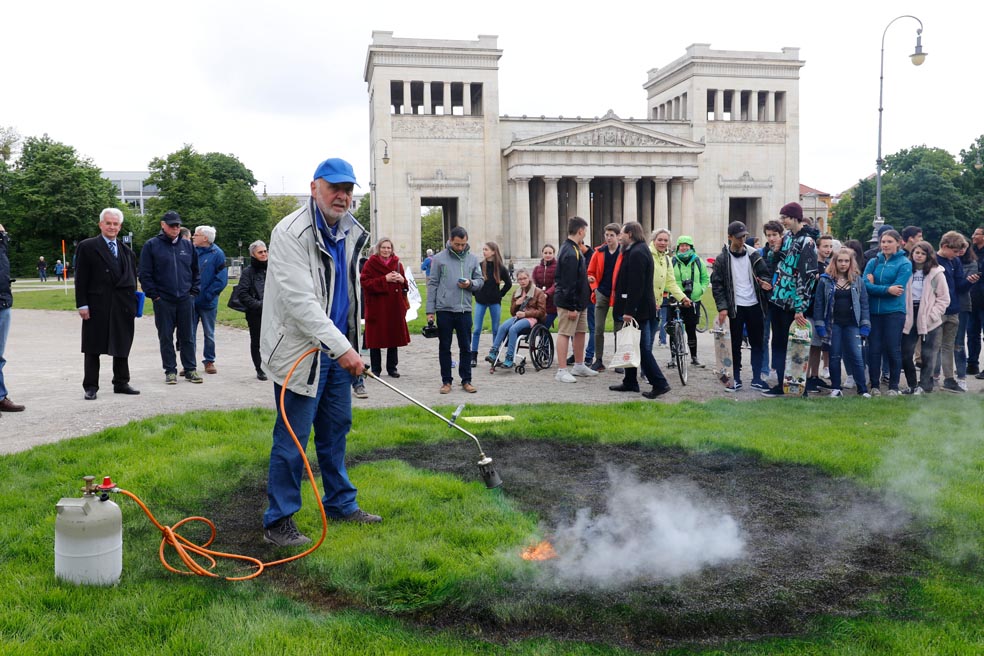 im Rasen des Königsplatzes an der Stelle der Bücherverbrennung von 1933 einen Brandfleck herstellen – damit kein Gras über die Geschichte wächst.